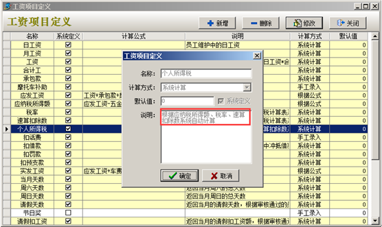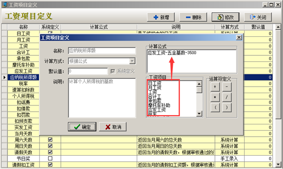 工程項目管理軟件中“五金基數(shù)”及“個人所得稅”在工資項目定義中設置好之后,在生成工資表時系統(tǒng)會扣除對應金額。如圖: