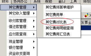預(yù)算與實(shí)際對(duì)比,在財(cái)務(wù)菜單中第一項(xiàng)【其他費(fèi)管理】,【其他費(fèi)對(duì)比表】中查詢。
