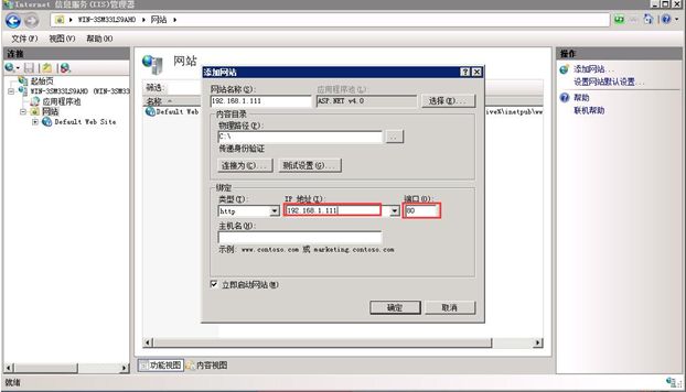 5. 在運(yùn)行狀態(tài)輸入inetmgr,打開IIS管理器 添加網(wǎng)站,并選擇好應(yīng)用程序池為 Asp.net 4.0 及網(wǎng)頁(yè)所在主目錄。