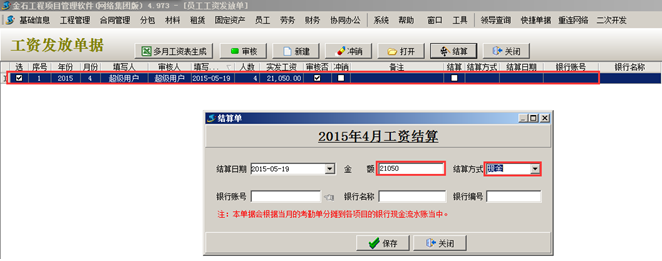 工程管理軟件中結(jié)算時,選中審核通過的“員工工資表”,點(diǎn)擊“結(jié)算”的按鈕,可選擇“分人結(jié)算”或“整單結(jié)算”。