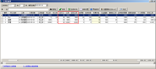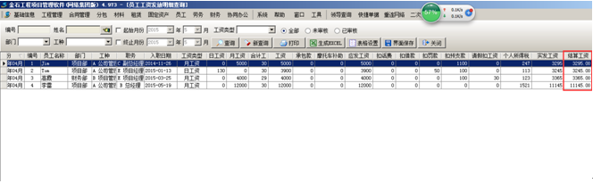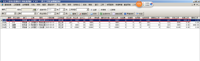 工程管理軟件工資表生成之后員工在不同項(xiàng)目上出勤的工資會生成到同一張工資表中,如圖: