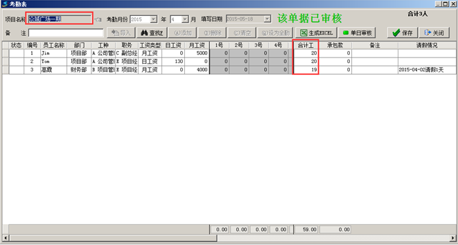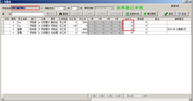 例如,Jim、Tom、高霞都是在同月出勤了兩個項(xiàng)目“眾城廣場一期”和“眾城廣場二期”,則在工程管理軟件中四月份分別做兩給項(xiàng)目的考勤表。如圖: