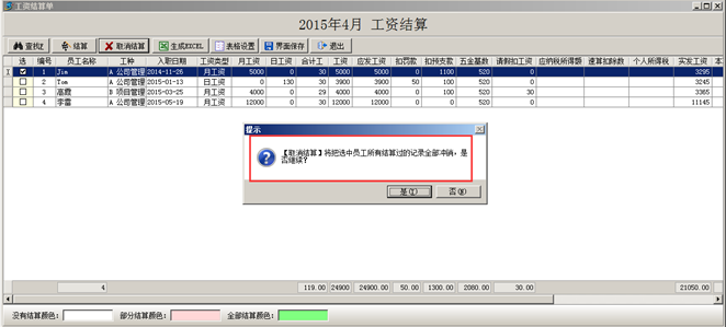 如果想取消結(jié)算,則選中對應(yīng)的員工工資信息,點(diǎn)擊“取消結(jié)算”的按鈕,確認(rèn)取消結(jié)算,則員工工資信息會恢復(fù)到未結(jié)算狀態(tài),如圖: