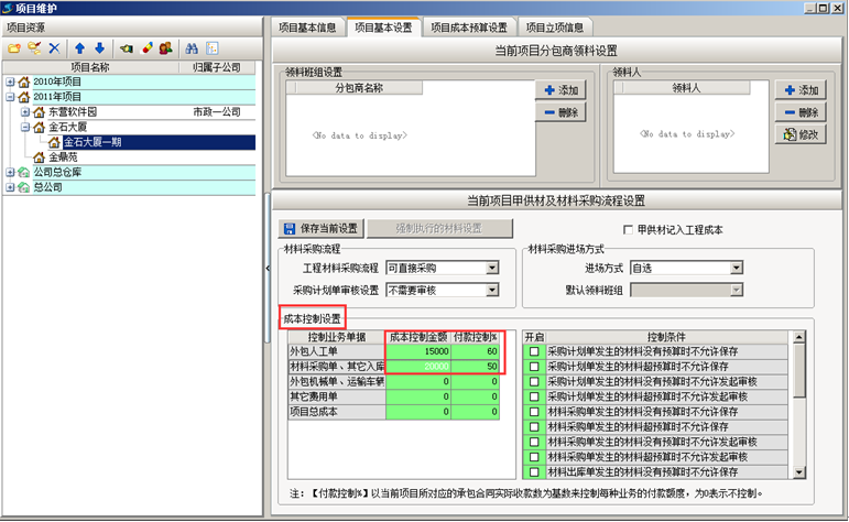 在“工程管理”-“項目維護”中進行“項目預(yù)算”的設(shè)置。如圖所示: