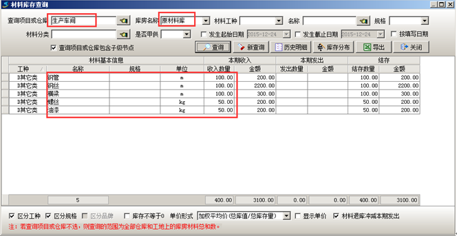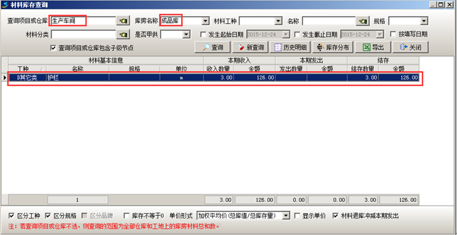 材料采購?fù)瓿芍罂稍趯?yīng)的材料庫中查到相應(yīng)的庫存,如圖: