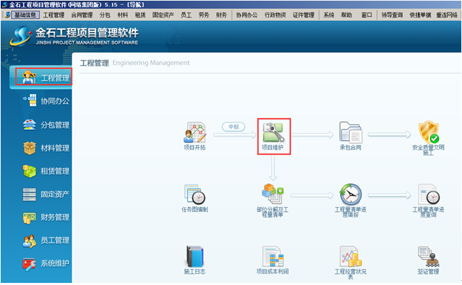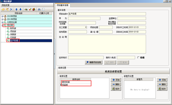 首先在金石工程管理軟件“工程管理”的“項目維護”中,在公司節(jié)點下建立“生產(chǎn)車間”并設(shè)立對應(yīng)庫房,這樣便于對用于生產(chǎn)的原材料或者產(chǎn)品進行管理。如圖: