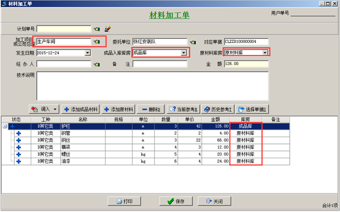 注:(1)在材料加工單的材料列表中對應(yīng)好各材料所在的庫房。否則系統(tǒng)會默認為默認的“成品入庫庫房”或“原材料庫房”。