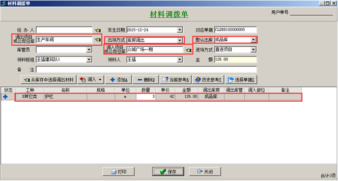 項目上使用產(chǎn)成品時,需要從“生產(chǎn)車間”將產(chǎn)品調(diào)撥到項目上,在工程管理軟件中做“材料調(diào)撥單”,填寫調(diào)撥單時,調(diào)出項目要選擇“生產(chǎn)車間”,出廠方式選擇“庫房調(diào)出”,并選擇對應(yīng)的庫房,選擇對應(yīng)的調(diào)入項目以及“領(lǐng)料班組”和“領(lǐng)料人”。如圖: