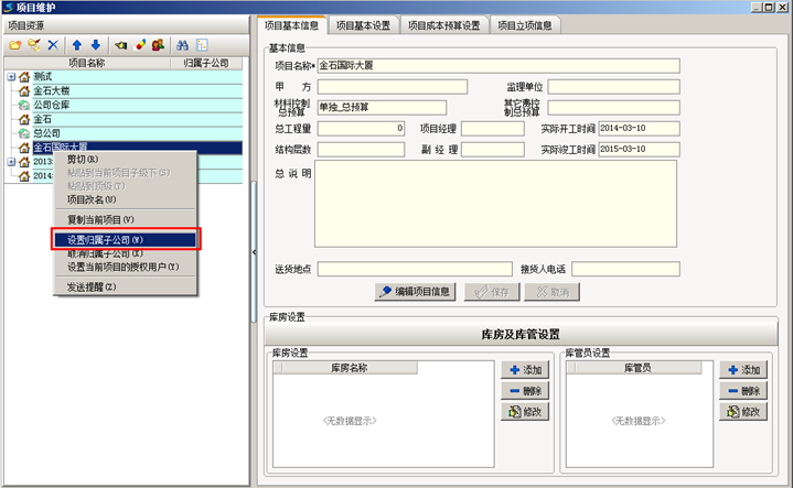 選擇項(xiàng)目右鍵單擊,點(diǎn)設(shè)置歸屬子公司,