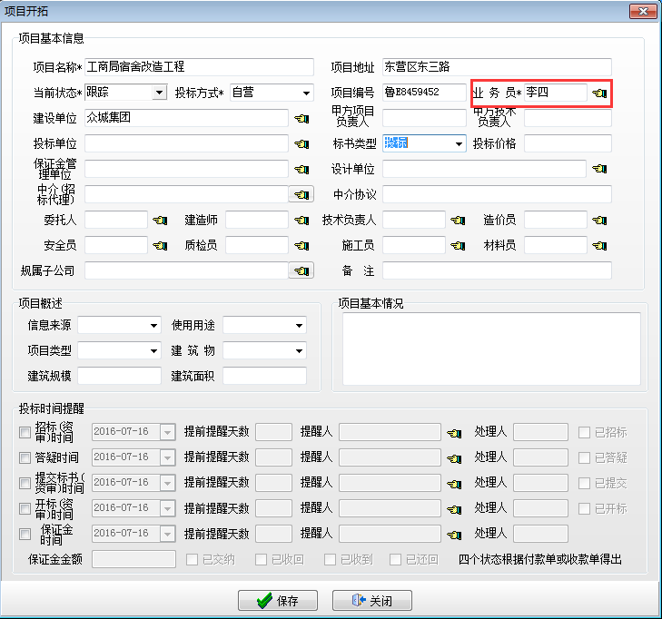 在施工項(xiàng)目管理軟件項(xiàng)目開(kāi)拓建立開(kāi)拓項(xiàng)目,【項(xiàng)目開(kāi)拓】中業(yè)務(wù)員必須要與【銷售任務(wù)】中業(yè)務(wù)負(fù)責(zé)人一致。如下圖: