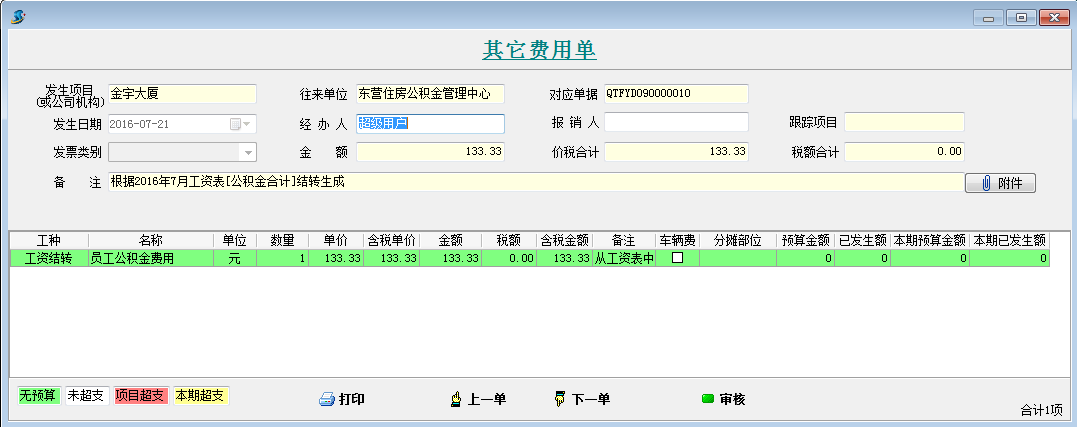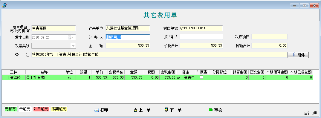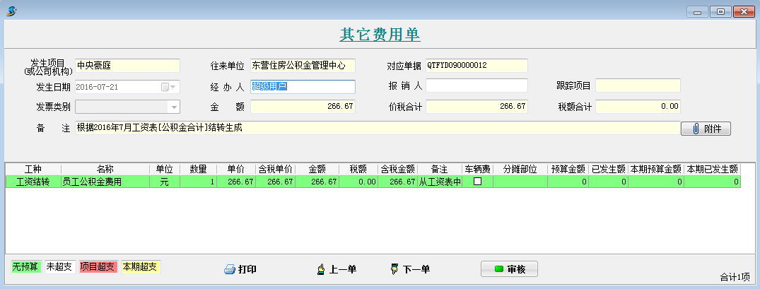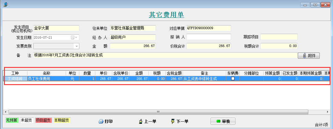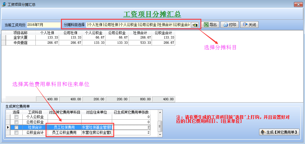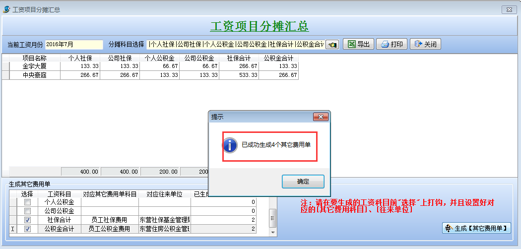 打開待攤費(fèi)用模塊,選擇好分?jǐn)偪颇?,列表中就?huì)顯示出每個(gè)項(xiàng)目分?jǐn)偪蛻舻拿骷?xì)。同時(shí)在這個(gè)模塊可以直接生成其它費(fèi)用單,選擇好社保合計(jì)和公積金合計(jì)的對(duì)應(yīng)其它費(fèi)用單科目和對(duì)應(yīng)往來(lái)單位,點(diǎn)擊生成工程項(xiàng)目管理系統(tǒng)【其它費(fèi)用單】,直接可以生成四張其他費(fèi)用單。