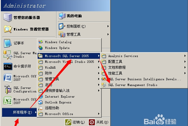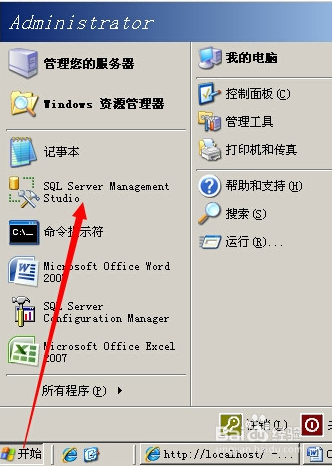 1、在開始菜單中單擊SQL Server Management Studio,啟動(dòng)數(shù)據(jù)庫。如果沒看到SQL Server Management Studio,可以在所有程序找到SqlServer2005