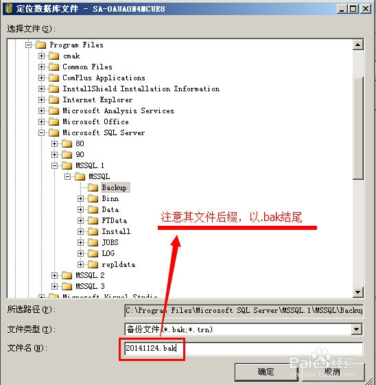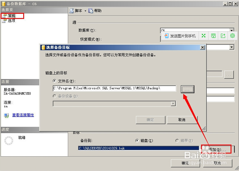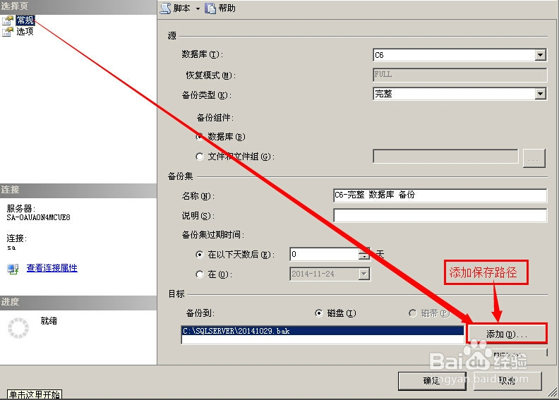 4、彈出備份數(shù)據(jù)庫窗口,在常規(guī)中設(shè)置保存路徑,步驟為首先點(diǎn)擊左邊的常規(guī),然后點(diǎn)擊添加,在彈出框中點(diǎn)擊省略號(hào)選擇文件的保存,后綴名稱為.bak,填寫完成之后,點(diǎn)擊確定