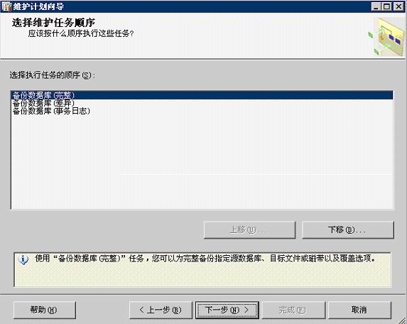 8、點(diǎn)擊【下一步】按鈕:彈出以下【選擇維護(hù)任務(wù)順序】對(duì)話框,如果有多個(gè)維護(hù)任務(wù),在此可以通過【上移】和【下移】兩個(gè)按鈕來設(shè)置維護(hù)任務(wù)的順序,設(shè)置完畢后單擊【下一步】按鈕。