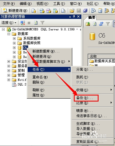 3、雙擊數(shù)據(jù)庫,右擊數(shù)據(jù)庫名,然后鼠標(biāo)移動(dòng)到任務(wù),點(diǎn)擊備份