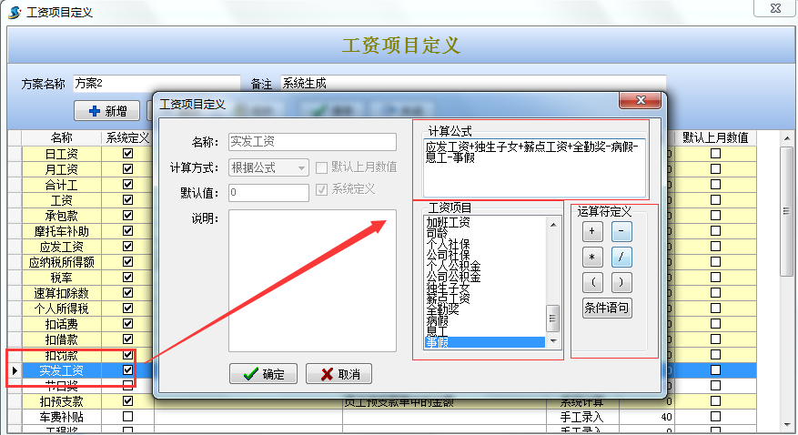 雙擊選擇實發(fā)工資,通過工資項目和運(yùn)算符定義編輯計算公式(運(yùn)算字符一定要用鼠標(biāo)點擊下圖運(yùn)算符定義選擇,不能用鍵盤直接輸入)