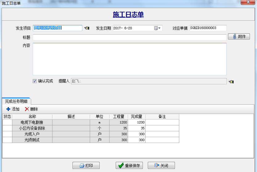 3、派工人員根據(jù)完成情況進(jìn)行施工日志填報(bào),“確認(rèn)完成”打鉤可設(shè)置提醒人查看
