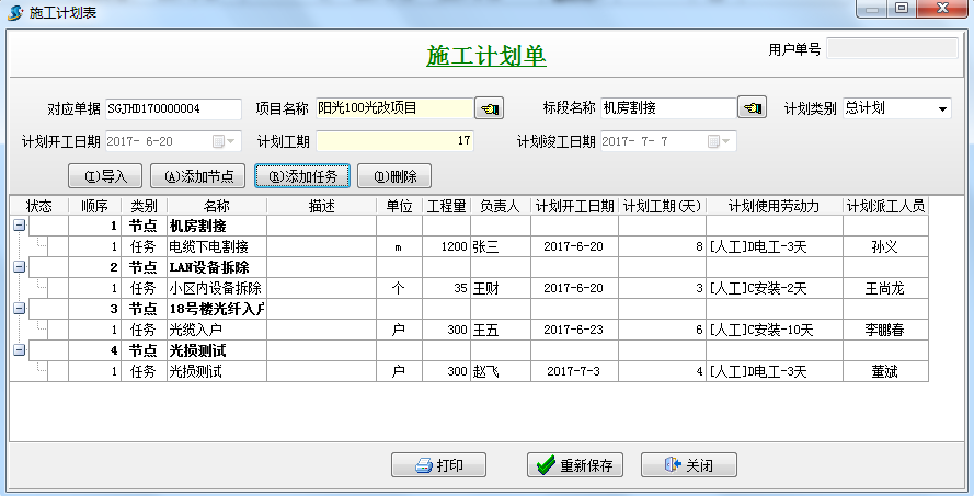 新建【施工計(jì)劃單】,先添加節(jié)點(diǎn),在添加任務(wù),輸入工程量、負(fù)責(zé)人、計(jì)劃開(kāi)工日期等信息