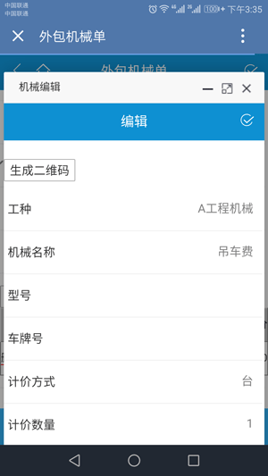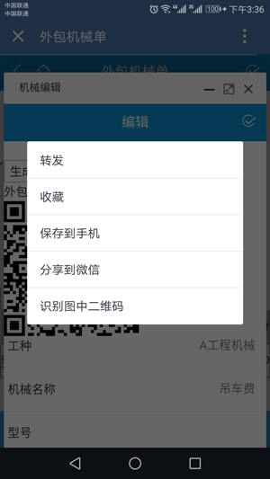 2、金石工程管理軟件手機(jī)端也可以生成二維碼,在配置好企業(yè)微信的前提下,進(jìn)入手機(jī)端的單據(jù)填寫(xiě)并打開(kāi)外包機(jī)械單,如圖所示
