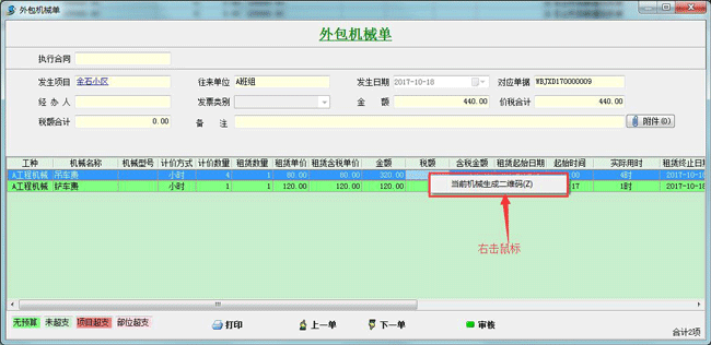 1、在最新版的金石工程項(xiàng)目管理軟件6.0中,外包機(jī)械單有一個(gè)更新,就是添加了二維碼打印的功能,如下圖