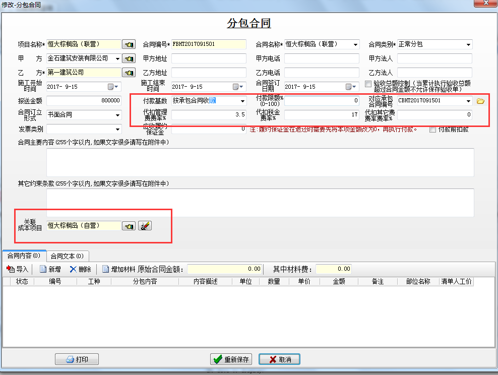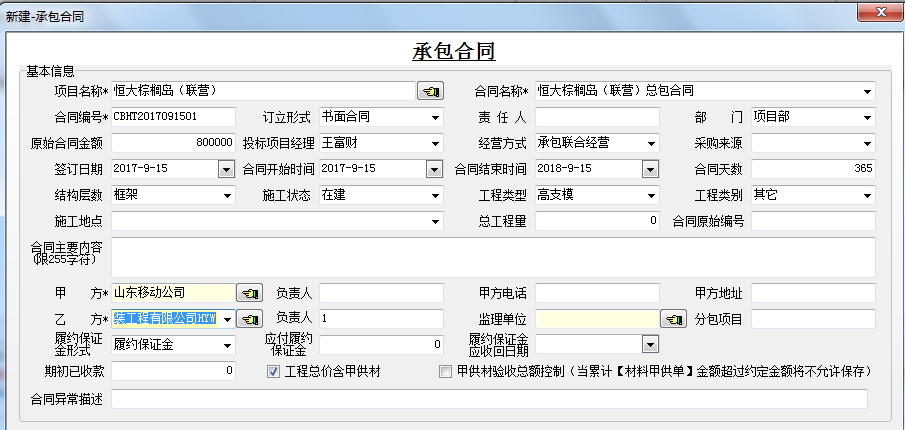 ①在“恒大棕櫚島(聯(lián)營(yíng))”項(xiàng)目下創(chuàng)建“承包合同”、“分包合同”等