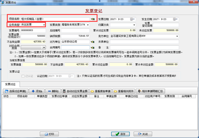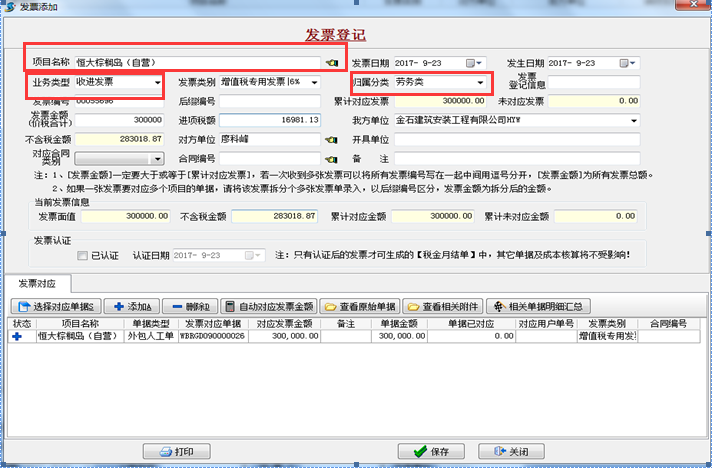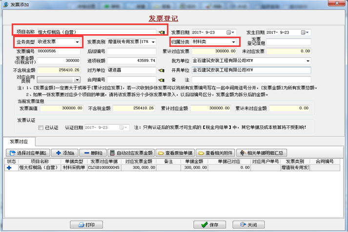 ②進(jìn)項(xiàng)稅對(duì)應(yīng)材料票:菜單欄【財(cái)務(wù)管理】→【發(fā)票管理】“收進(jìn)發(fā)票”歸屬分類選材料票(在一個(gè)項(xiàng)目中應(yīng)控制材料票、勞務(wù)票等所占的比例,此功能用于計(jì)算掛靠單位發(fā)票歸屬所占百分比)