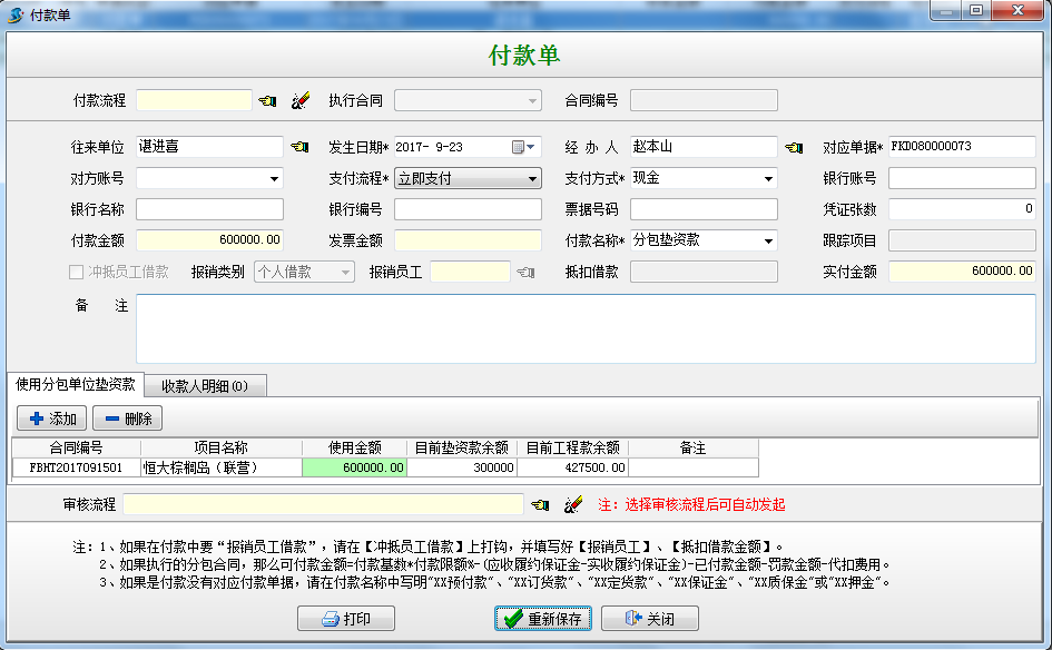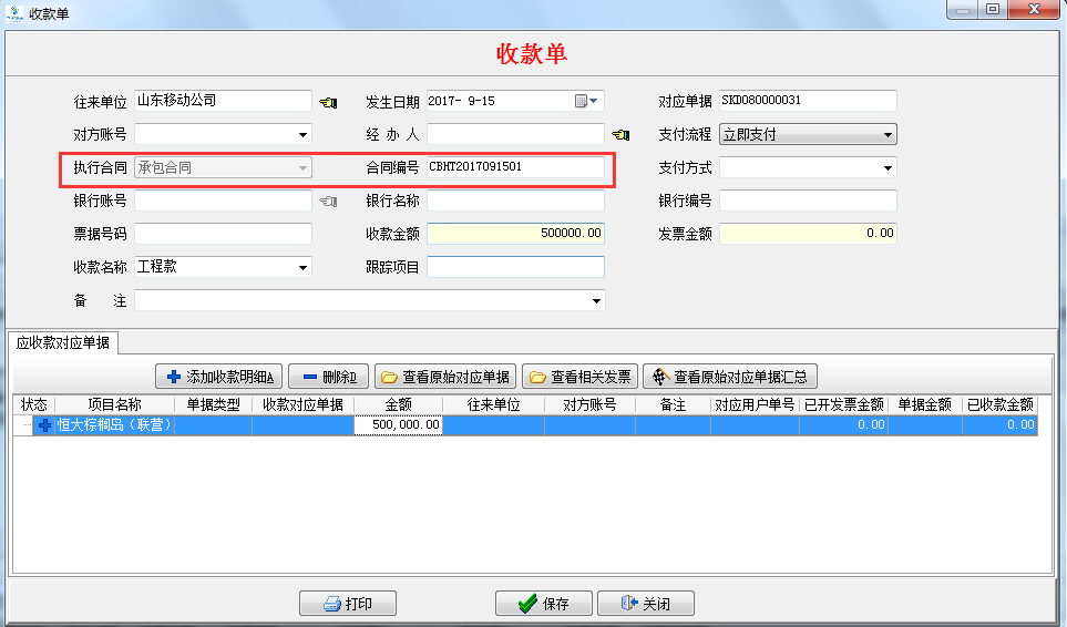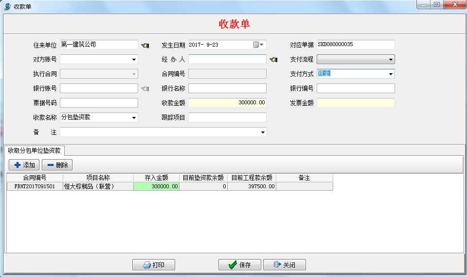 ④“分包合同”→“墊資款記錄”→“執(zhí)行收款”, 【收款單】墊資款收到(此處的往來單位是掛靠我公司資質(zhì)的聯(lián)營(yíng)單位)