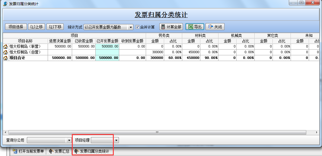 發(fā)票歸屬分類統(tǒng)計(jì)(在一個(gè)項(xiàng)目中應(yīng)控制材料票、勞務(wù)票等所占的比例,此功能用于計(jì)算掛靠單位發(fā)票歸屬所占百分比)