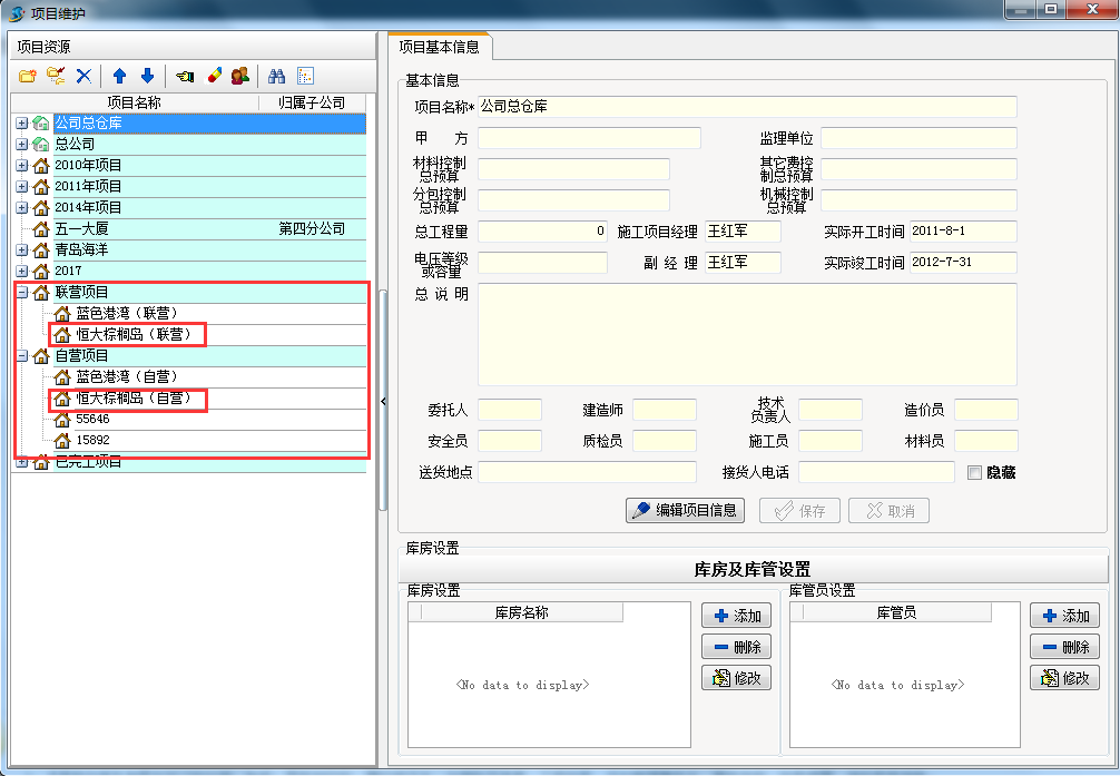 注:首先在項(xiàng)目維護(hù)中維護(hù)兩個(gè)大類(自營(yíng)項(xiàng)目和聯(lián)營(yíng)項(xiàng)目),兩個(gè)大類分別建立項(xiàng)目,其中在“自營(yíng)項(xiàng)目”中記錄驗(yàn)收(為了統(tǒng)計(jì)掛靠單位成本)和對(duì)應(yīng)發(fā)票(為了統(tǒng)計(jì)發(fā)票歸屬分類),“聯(lián)營(yíng)項(xiàng)目”中只做【財(cái)務(wù)管理】收付款不做相關(guān)的成本業(yè)務(wù)單據(jù)(如下圖)。