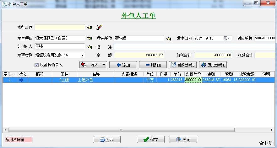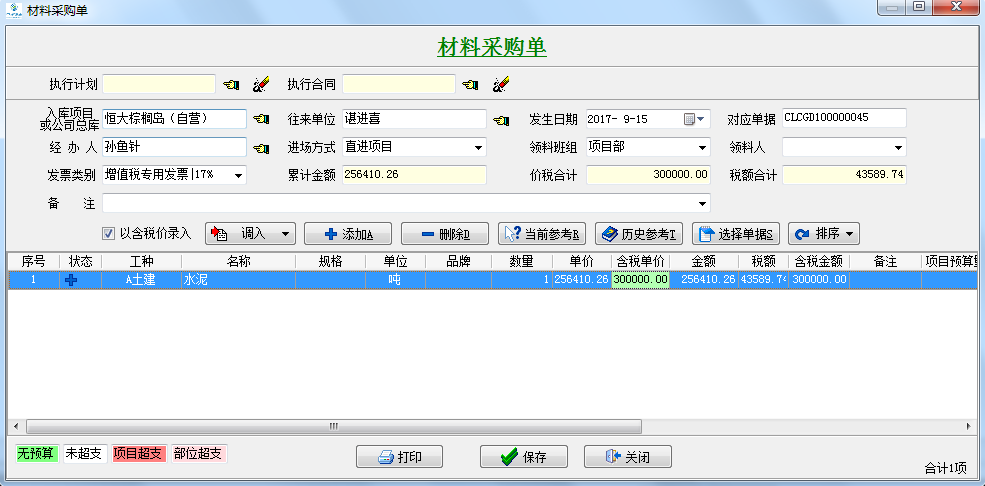 ①在“恒大棕櫚島(自營(yíng))”項(xiàng)目下驗(yàn)收(如有預(yù)算先做預(yù)算單)【材料采購(gòu)單】和【外包人工單】各30萬元并對(duì)應(yīng)“進(jìn)項(xiàng)發(fā)票”。