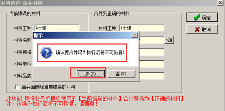 【修改】、【合并】兩者相同點:都可批量替換業(yè)務庫的數(shù)據(jù)。兩者不同點:【修改】一般應用于將錯誤的材料名稱修正為正確的叫法?!竞喜ⅰ恳话闶窃诓牧蠋熘幸呀?jīng)存在正確的材料名稱、如:A1,但工地人員沒有找到,又添了另一個名稱、如:A2,并做了業(yè)務單據(jù)。此時需要將A2合并成A1。