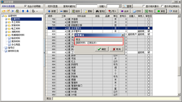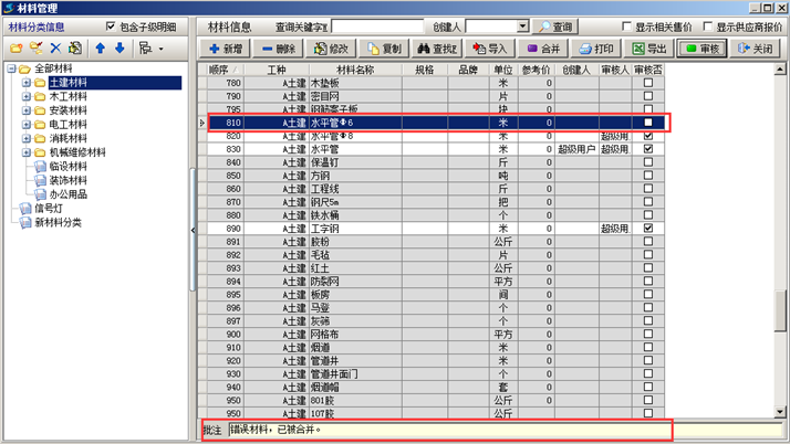 在工地人員使用工程管理軟件錄入業(yè)務單據(jù)過程中,往往對工程管理軟件的材料庫中維護員添加的材料不熟悉,已經(jīng)維護好的材料在工程管理軟件中經(jīng)常找不到,自行添加了材料,但自己添加的材料和維護員添加的材料名稱差別很大,這樣程序無法識別是否有重復。此時需要讓維護員利用工程管理軟件的 【審核提醒】+【事后糾正】+【錯誤批注】 來在過程中指導工地人員的使用,糾正和統(tǒng)一材料的名稱的叫法。