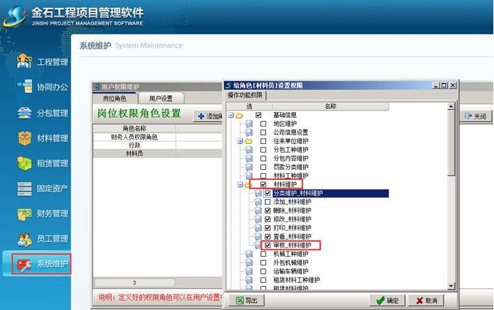 1、首先將 “審核_材料”的功能單獨分配給材料維護員一人。在系統(tǒng)中給工作人員分配權限,如圖所示: