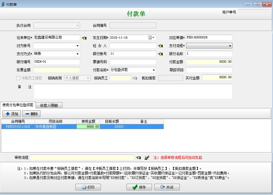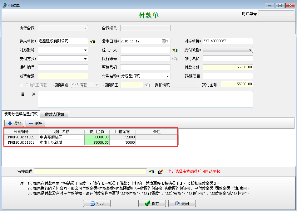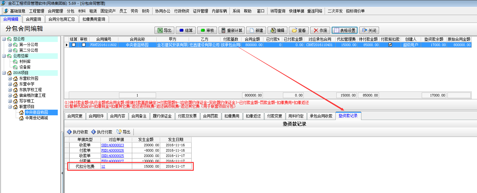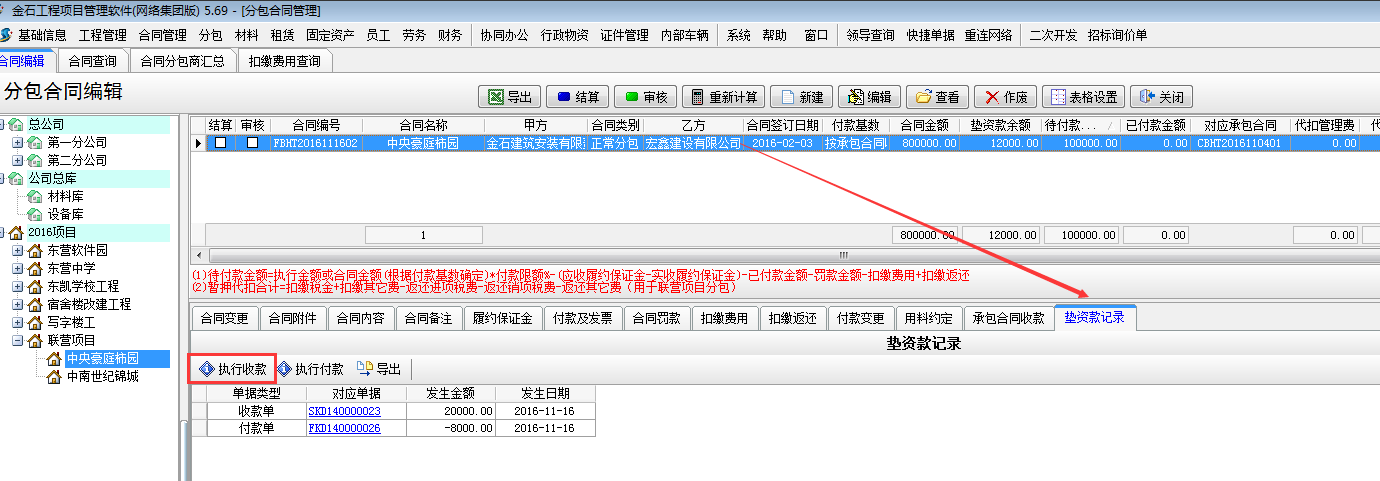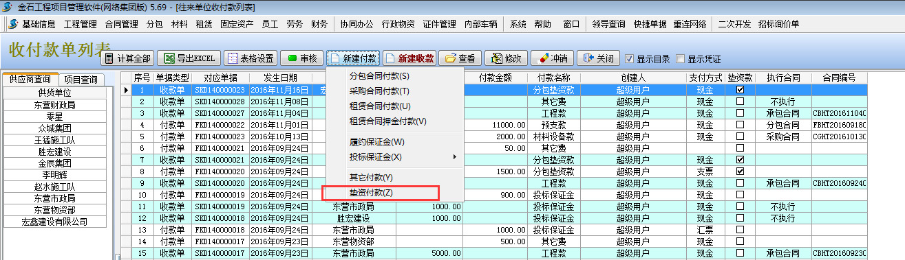 在【分包合同】-【墊資款記錄】處選擇執(zhí)行付款,或者在【財務(wù)管理】-【付款單收款單】新建付款單選擇墊資款付款。