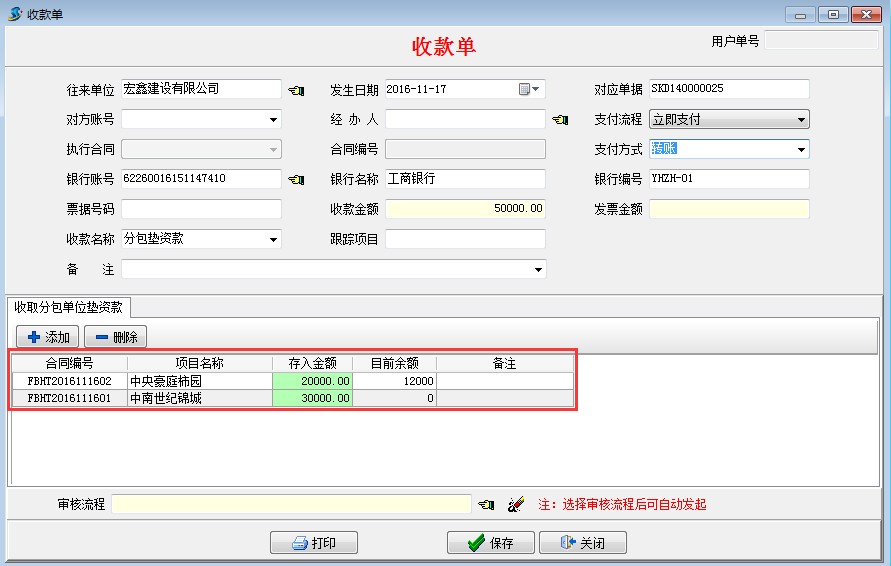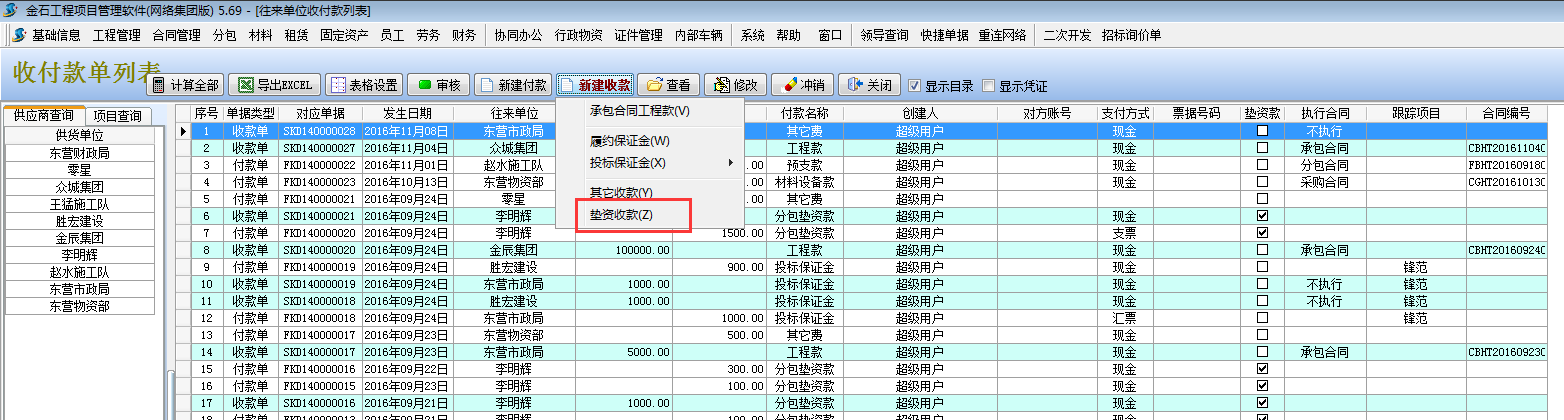在工程項目管理軟件【分包合同】-【墊支款記錄】處選擇執(zhí)行收款,或者在【財務(wù)管理】-【付款單收款單】新建收款單選擇墊資款收款。
