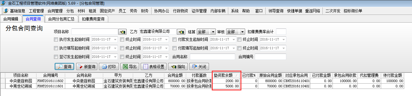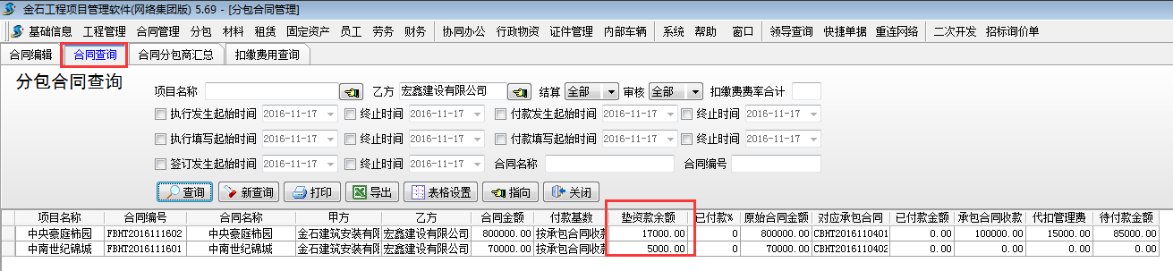 3.2 按合同查詢各合同墊資款余額??梢栽凇痉职贤?【合同查詢】處查詢。