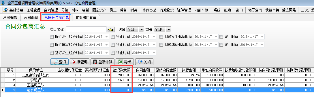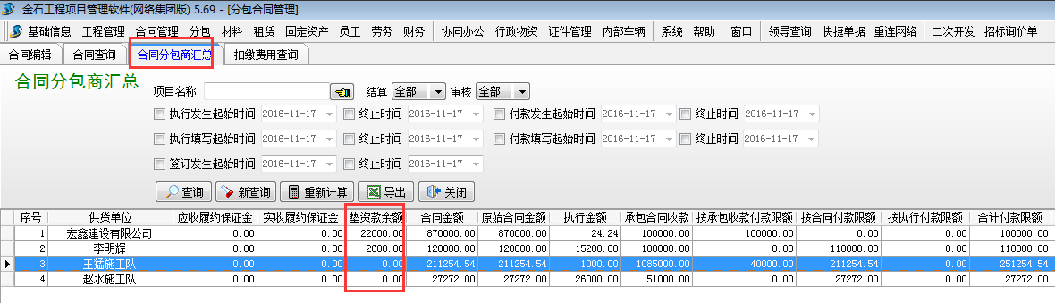 3.1 查詢聯(lián)營單位所有墊資款余額??梢栽凇痉职贤?【合同分包商匯總】處查詢。