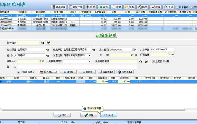該單據(jù)是工程管理系統(tǒng)中車輛管理的基礎(chǔ)憑證,單據(jù)內(nèi)部的數(shù)據(jù),會對【工程成本】、【應(yīng)付賬款查詢】、【供應(yīng)商應(yīng)付賬款匯總查詢】、【運輸車輛匯總表】這幾個模塊產(chǎn)生影響。