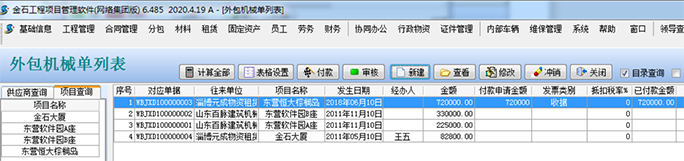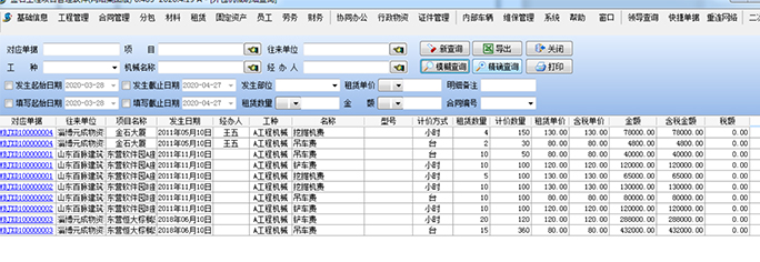 同時,已經(jīng)生成的各種信息,可以在【外包機械明細查詢】模塊查詢所有的機械往來明細。