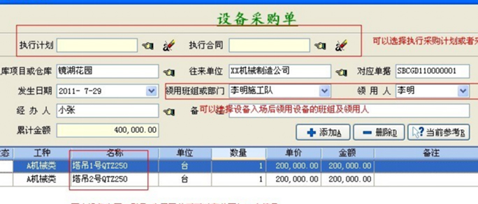 在使用機械設(shè)備的過程由于老化、意外事故等情況,需要重新采購設(shè)備。那么可以執(zhí)行設(shè)備采購合同,設(shè)備的基礎(chǔ)信息可以直接從合同中導(dǎo)入。