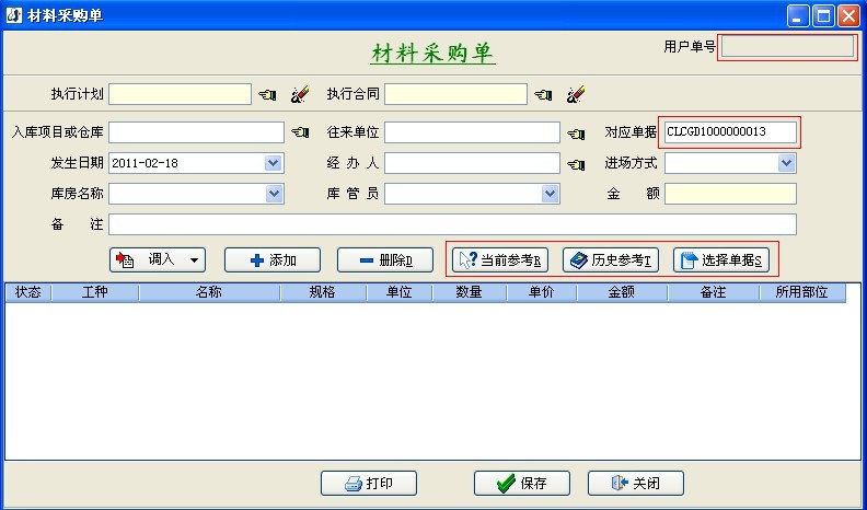 【選擇單據(jù)】:根據(jù)歷史發(fā)生的同類單據(jù)再次選擇,提高錄入效率。如:在【材料出庫(kù)單】中可以通過(guò)【選擇單據(jù)】調(diào)用【材料采購(gòu)單】的入庫(kù)單明細(xì),即要填寫(xiě)的出庫(kù)材料直接從采購(gòu)入庫(kù)的材料中選擇出來(lái)。