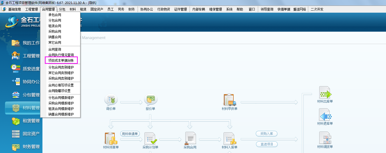 操作步驟:菜單欄→合同管理→項目成本單臺賬查詢