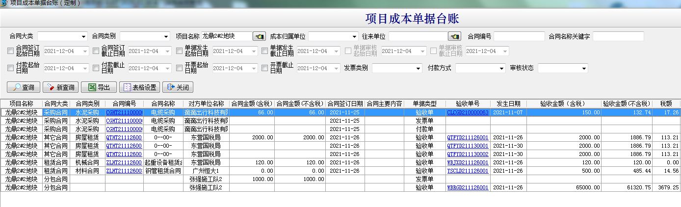 項目成本單據臺賬是用來查詢有合同(采購合同、分包合同、租賃合同、其它合同)或者無合同的驗收單(材料采購單、設備采購單;分包人工;外包機械單、租賃結算單、運輸車輛單;其它費用單;設備維修單)、付款單、發(fā)票單。