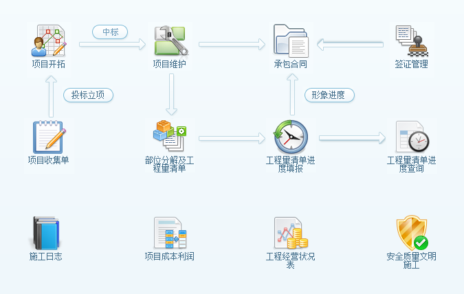 裝修工程項(xiàng)目管理軟件創(chuàng)建完善的管理體系,規(guī)范數(shù)據(jù)標(biāo)準(zhǔn)、管理步驟、信息統(tǒng)計(jì)標(biāo)準(zhǔn)、規(guī)范業(yè)務(wù)管理,增強(qiáng)企業(yè)競(jìng)爭(zhēng)力。因此,在多年的實(shí)踐中,金石軟件開(kāi)發(fā)了裝飾行業(yè)的企業(yè)管理體系,整合了管理規(guī)定,滿(mǎn)足了這類(lèi)企業(yè)提出的綜合多項(xiàng)目管理理念,如圖所示:
