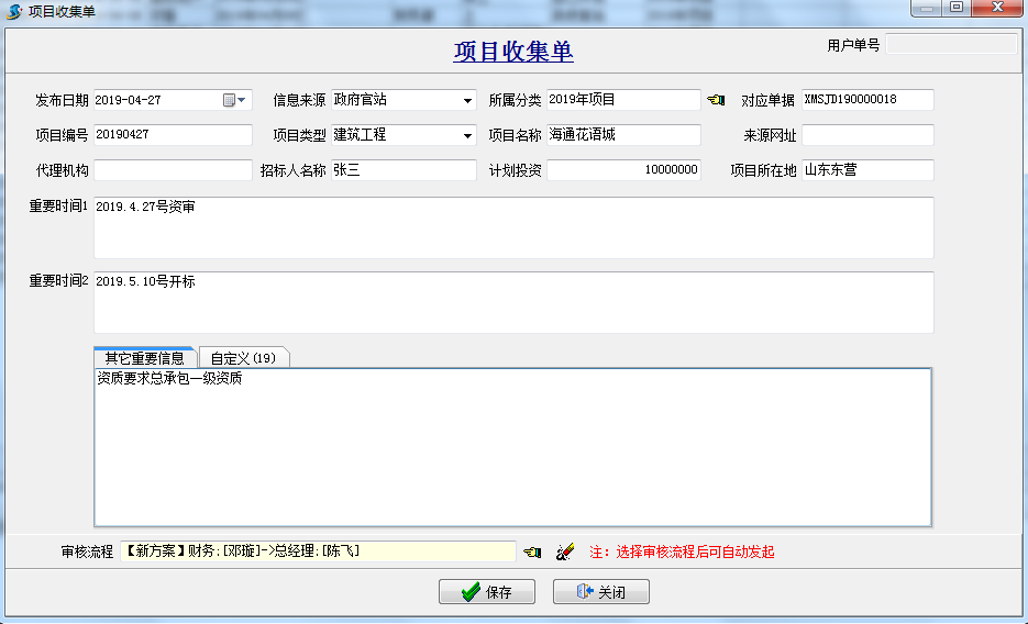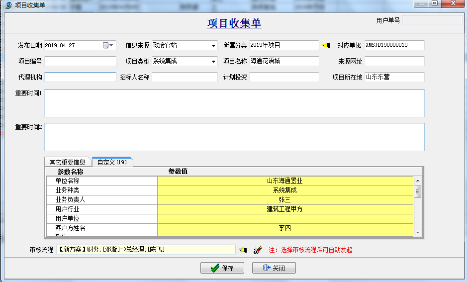 項(xiàng)目收集單:主要是用于項(xiàng)目投標(biāo)前的收集,公司銷售人員將在“政府網(wǎng)站” 、“自己開拓”等項(xiàng)目前期信息歸檔并走相應(yīng)的公司內(nèi)審批流程,確定哪些項(xiàng)目我們可以去參與投標(biāo)。