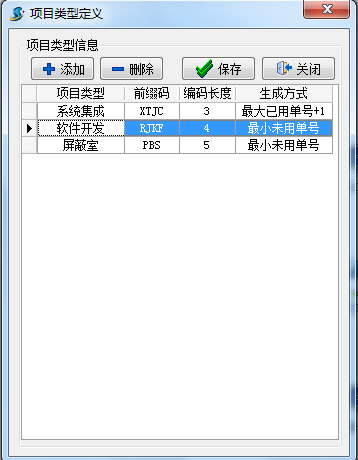 ①點(diǎn)“添加”按鍵增加豎列; ②“項(xiàng)目類型”輸入需要的項(xiàng)目類型; ③“前綴碼”列輸入自動(dòng)流轉(zhuǎn)的項(xiàng)目編號; ④“編碼長度”列為不含前綴的數(shù)值長度;