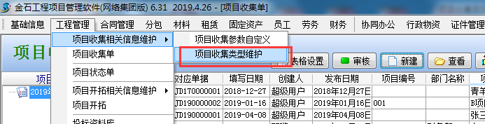 2、項(xiàng)目收集類型:菜單欄 “工程管理模塊”→“ 項(xiàng)目收集類型”