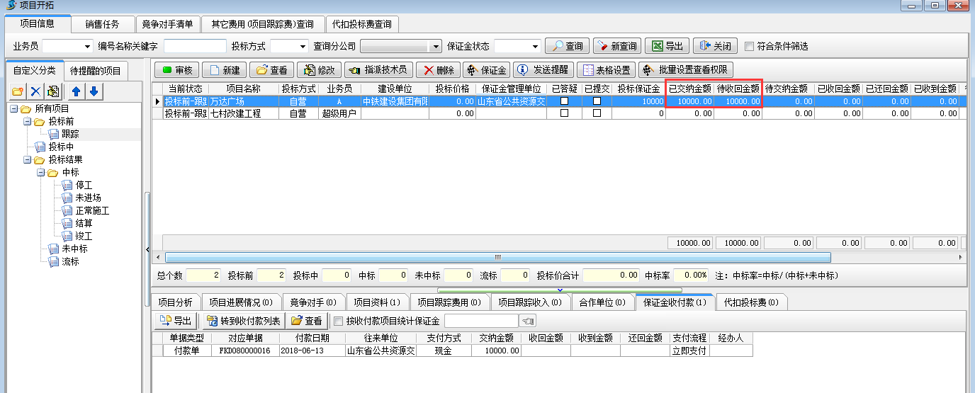 付款完成,工程管理軟件中待交納金額減少,已交納金額增加,并且可查看到對應項目的保證金付款記錄,如圖所示: