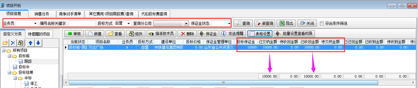在工程管理軟件項目開拓列表中可以查詢多個項目投標保證金的九項合計,如圖所示:也可根據(jù)投標方式、業(yè)務員、項目狀態(tài)查詢。