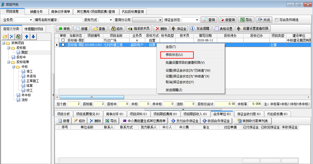 投標結(jié)果出來以后,將狀態(tài)改到“投標結(jié)果”的狀態(tài),如圖: